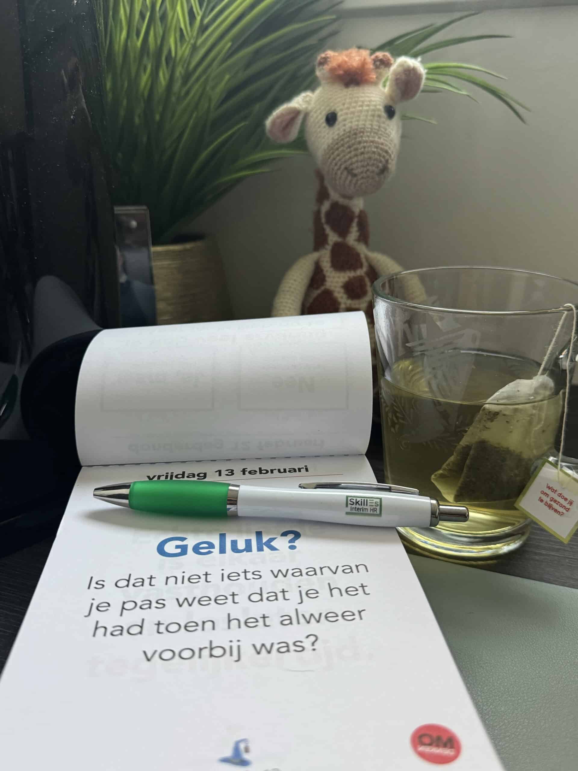 Op mijn bureau ligt een klein stilleven: het computerscherm van de Open Universiteit, een kop koffie, een mandarijntje en letterkoekjes die samen Love en Kus vormen. Even een moment van spel en aandacht, stilstaan in de drukte van het leven.